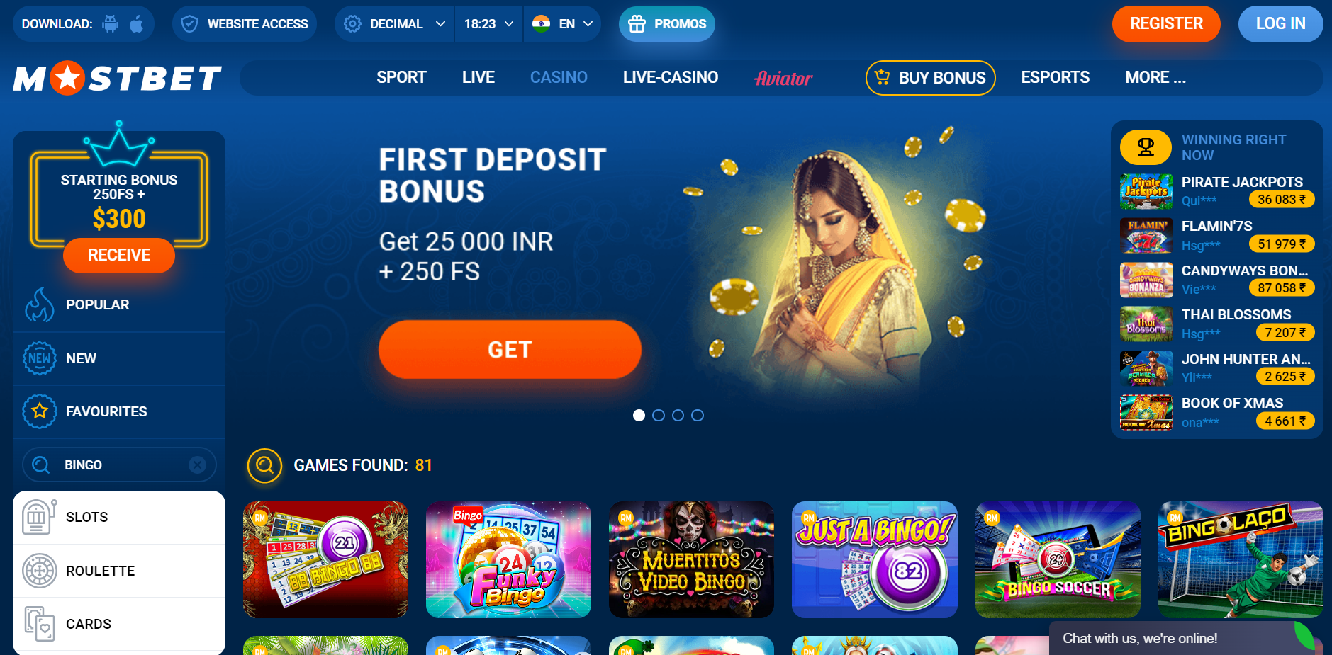 | Jonli onlayn kazino o'yinlari | Jonli Casino Poker, Jonli Blackjack, Jonli Ruletka, Jonli Baccarat, O'smir Patti, Andar Bahar |